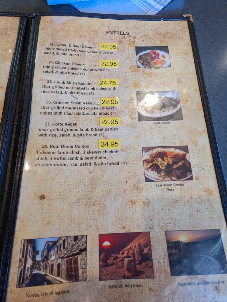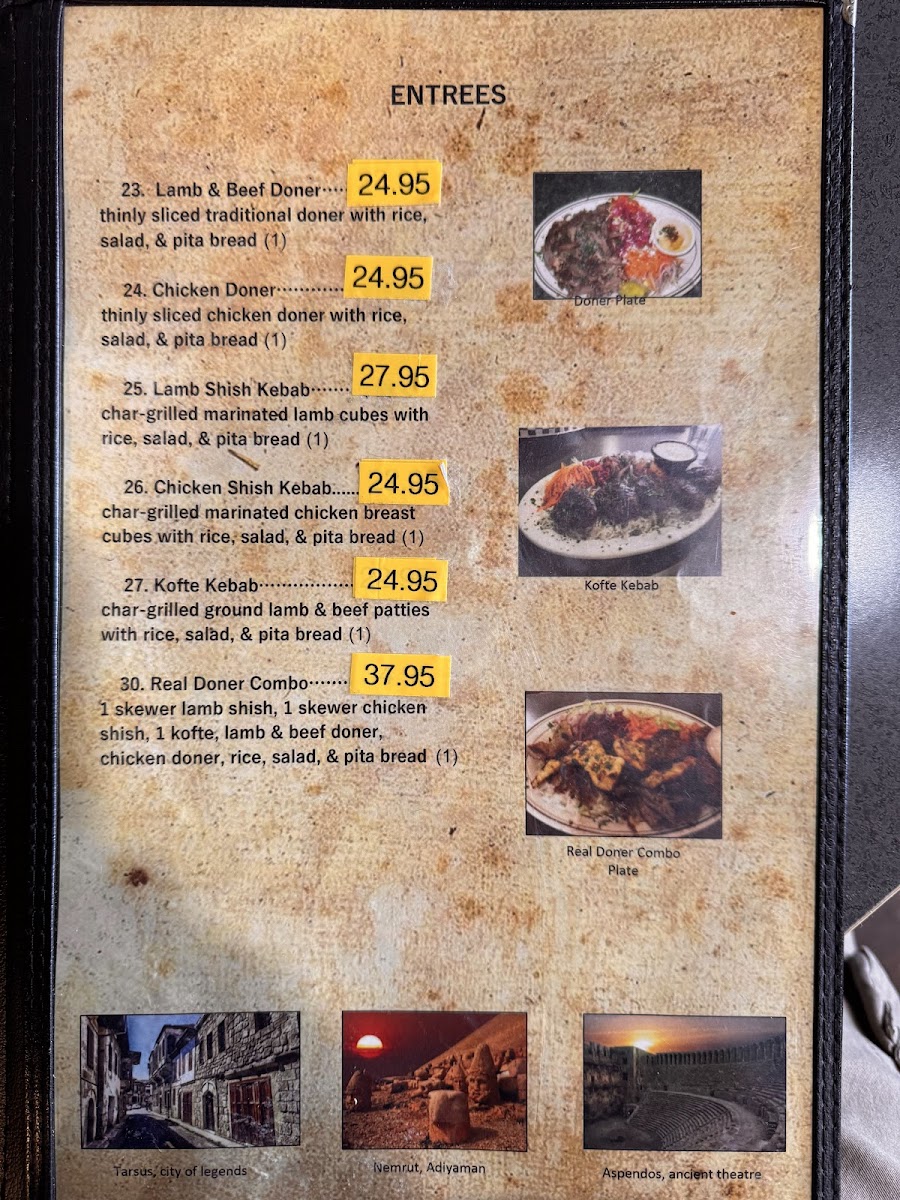 Moving on to the entrees, the options are similar to the wraps but served as larger plates, perfect for a more filling meal. The Lamb & Beef Doner, Chicken Doner, Lamb Shish Kebab, Chicken Shish Kebab, and Kofte Kebab provide generous portions of meat, each prepared with a delicious balance of spices that capture the essence of Turkish grilling traditions.