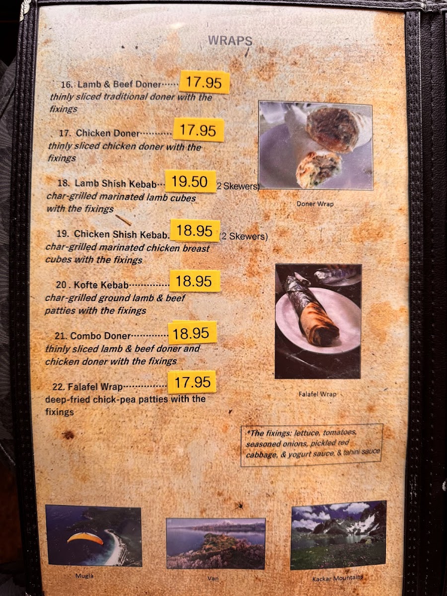 The wraps menu is a highlight, offering a selection of hearty and satisfying options. The Lamb & Beef Doner and Chicken Doner are the star items, featuring juicy, flavorful meats wrapped in soft pita. For those who prefer grilled meats, Lamb Shish Kebab and Chicken Shish Kebab wraps are available, bringing tender, smoky flavors to every bite. Alternatively, the Kofte Kebab Wrap is a great choice for those who enjoy seasoned ground meat, wrapped to perfection for a satisfying experience.